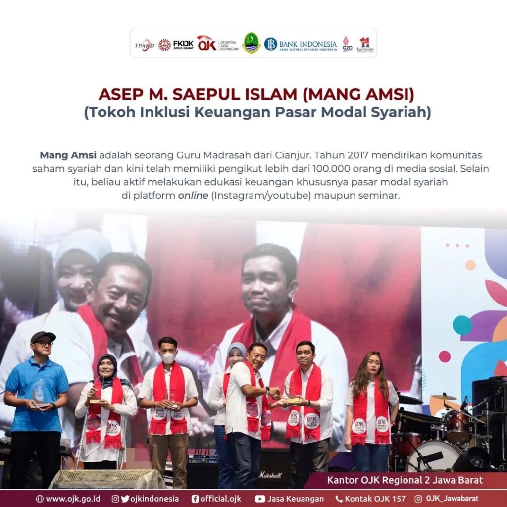 Prestasi yang diraih Mang Amsi juga sangat membanggakan. Pada tahun 2022, ia terpilih sebagai Guru Madrasah Berprestasi tingkat Kabupaten Cianjur, Wilayah II Bogor, hingga Provinsi Jawa Barat. Selain itu, ia juga dinobatkan sebagai Tokoh Penggerak Inklusi Pasar Modal Syariah oleh Otoritas Jasa Keuangan (OJK) Jawa Barat.